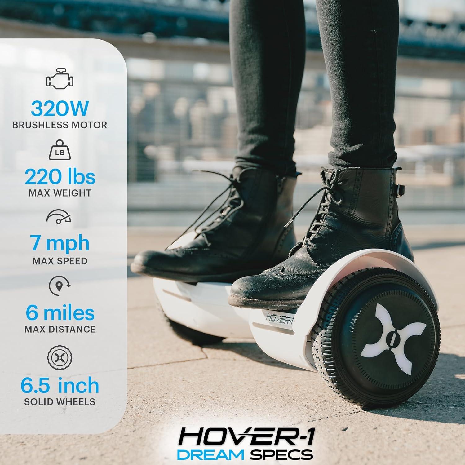 Glide in style with Hover-1 Dream Electric Scooter, a futuristic transportation device that makes your commute fun, cool and enjoyable. Designed for both indoor and outdoor riding, this hoverboard scooter features step-on mat sensors, dual LED headlights, 6.5″ non-pneumatic LED wheels and powerful 200W dual motors that can reach a speed of 7 mph even on a 10-degree incline. With a self-balancing design, this easy to learn scooter is perfect for beginners and young adults as it provides stability and control, and keeps you upright. Equipped with a 25.2V/4.0 Ah Li-ion rechargeable battery, this two-wheel scooter can travel up to 6 miles on a 5-hour charge. The battery indicators on the board notify you about the battery level at all times. Meeting all necessary safety standards, it is UL2272 certified and MSDS & UN 38.3 tested. Whether you are a student, a tourist or an office goer, buy one for yourself or gift it to your friends or family for Christmas or Birthdays. We encourage all riders to wear proper safety gear to protect themselves. Visit the Hover-1 Brand Store (click on our brand) to find helmets, knee & elbow pads and get ready to hit the town.